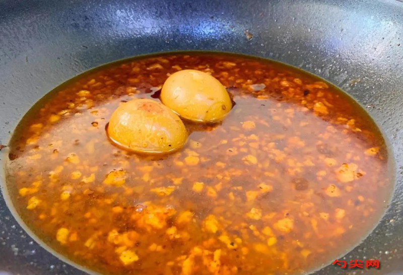 4、全部炒勻以后,加入適量的清水,再加入比比平時量稍微大一些的鹽,然后把鹵料裝入料盒中,下到鍋里,再準備兩顆剝了皮的雞蛋放進去,小火鹵一個小時。