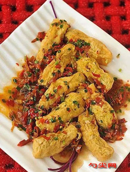 工藝:1.首先將豆腐切長方形的塊、水發(fā)香菇切粒;2.準(zhǔn)備一個碗,放入豬肉泥、富磷聯(lián)C、香菇粒,磕入一個雞蛋,加小半勺鹽,攪拌均勻;3.準(zhǔn)備小半鍋油,燒至八成熱,下入豆腐塊,炸至顏色金黃、酥脆,撈出。接著在炸好的豆腐塊一端剪出一個小口,將肉餡從小口處塞入豆腐內(nèi);4.鍋中準(zhǔn)備小半鍋清水,將豆腐隔水蒸十五分鐘,取出,擺盤;5.鍋中放入油,加入剁辣椒炒香,接著加少量清水,小半勺鹽、少許白糖,撒上胡椒粉,待水開后,淋入適量水淀粉拌勻、麻油提鮮,澆于蒸好的豆腐上即可。
