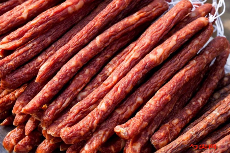 5、灌好后用綿線把腸衣扎成自己喜歡的長短度,然后用針扎刺肉腸,排除內部空氣,再用玫瑰露抹干凈肉腸表面的污物,拿到透風透氣的地方晾曬,大約7-10天就能晾曬干爽。