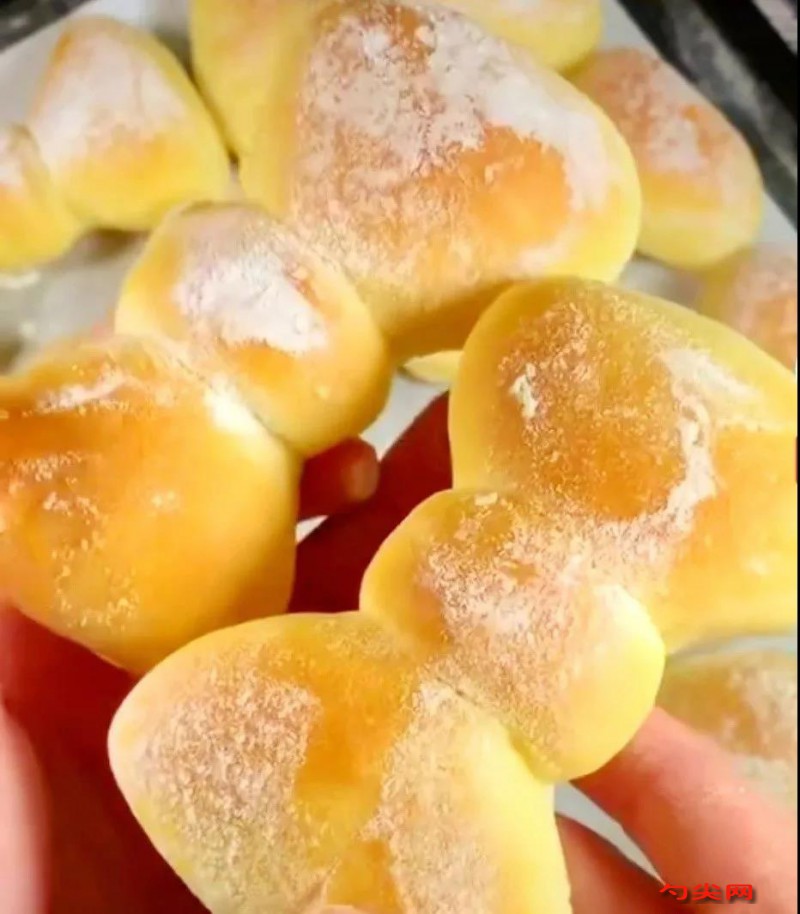 提前5分鐘預熱烤箱,待蝴蝶結發酵至兩倍大,用篩子撒上少許干面粉。