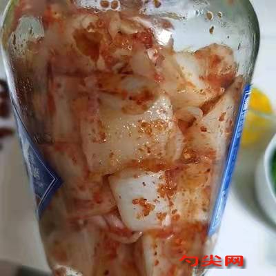 3、嘗一口腌制好的白蘿卜,如果覺得咸,可清水沖洗一下,然后倒入混好的料攪拌,冰箱冷餐一天即可食用