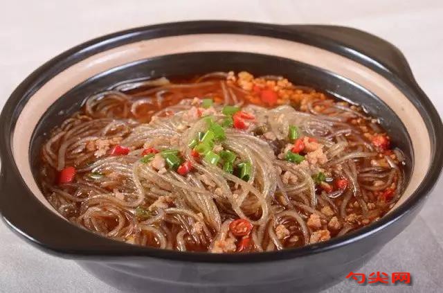 2、鍋入芽菜油30克燒至五成熱,下入姜末、蒜末各5克、郫縣豆瓣碎10克、味達蕾91 泡椒碎6克小火炒出紅油,倒入芽菜湯400克,調入雞精3克、白胡椒粉2克、白糖4克、陳醋5克,倒入紅薯粉塊翻勻,大火收汁,勾薄芡,起鍋前撒入花椒面6克翻勻,裝入熱砂鍋;