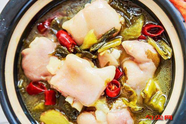 1.將豬手1只(共約800克)處理干凈后中間切開一分為二,鍋內(nèi)加水2千克放入白醋150克把豬手焯水煮白然后用涼水沖洗干凈。鍋內(nèi)加水2千克放入鮮香茅3根,姜80克,蔥50克,鹽、大廚味粉各10克,小火煲2小時(皮能扎透即可,不能過熟),撈出放入冰水中冰鎮(zhèn);