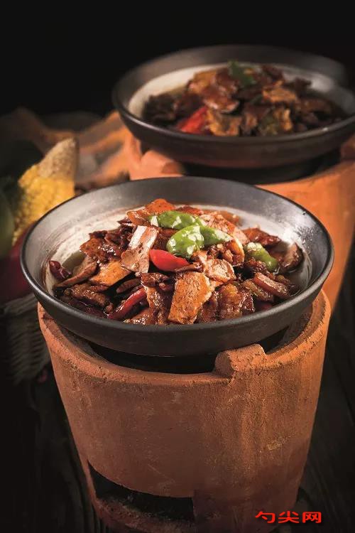 起菜 鍋內放入茶油75克、熟豬油25克,燒至五成熱時,先下入五花肉片150克,中火煸炒至肉成熟,放入大蒜片、姜片各5克爆香,下入紅椒塊、青椒塊各25克炒勻,下入醬干片,倒入啤酒100克、紅燒醬油15克、鹽3克、雞粉10克、味達蕾89#肉精油10克,大火翻炒均勻,出鍋裝入容器內,上桌后置于土爐上(土爐內放入燃燒的木炭)加熱食用。