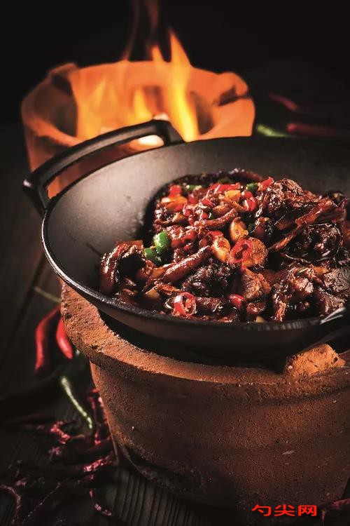 起菜 鍋內放入熟豬油50克,燒至五成熱時,先下入大蒜片、姜片、小米椒段各20克,海花紅辣椒段100克煸炒出香辣味,再放入牛腩、牛排和壓牛排的湯汁,大火加熱至湯汁收濃,出鍋裝入容器內,上桌后置于土爐上(土爐內放入燃燒的木炭)加熱食用。
