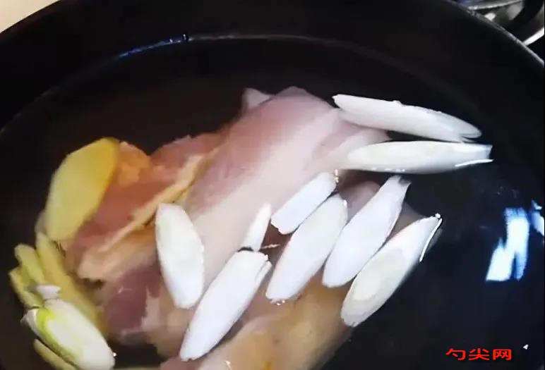 2. 鍋中燒水放五花肉,再放去腥三件套,蔥、姜、料酒,煮肉時要撇去浮沫。肉煮30分鐘,煮到筷子一扎就透。