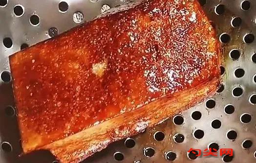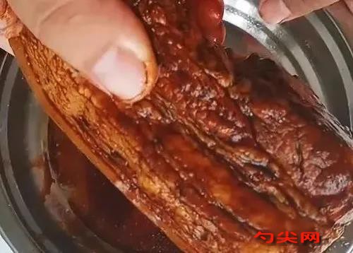 3. 撈出五花肉控干水分,放入盆中,用牙簽在表皮扎一些小洞,然后給五花肉均勻地抹上一層老抽(可以用蜂蜜或麥芽糖)。