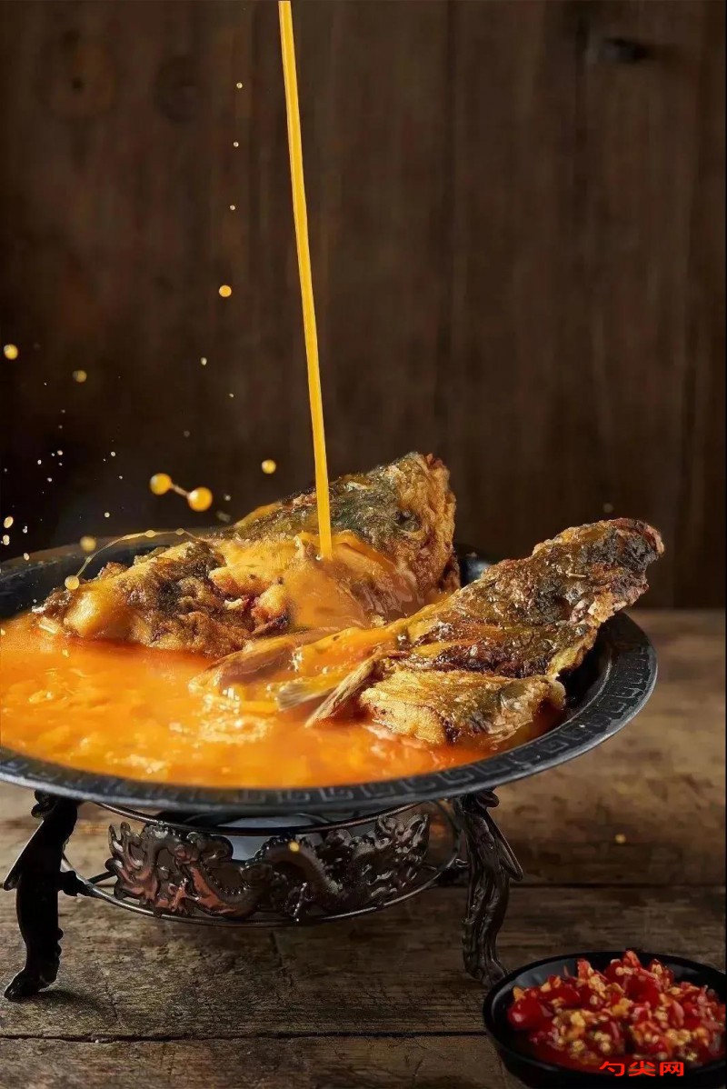 4. 將土椒圈裝盤墊底,放魚頭,淋原汁,點綴三葉香,與燜熟的泰國香米飯一同上桌即可。