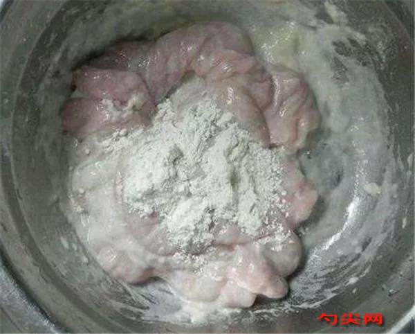 然后開始洗豬大腸。直接用清水洗不可取,越洗越油膩。那么我們需要先把豬大腸放入盆中,加入少許清水,把大腸表面淋濕,然后在大腸表面撒上適量的面粉。面粉有很強的吸附能力,可以把油脂、雜質等洗出來。
