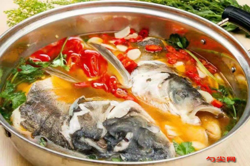 熬好的底料放入火鍋內,注入熬好的湯汁,用鹽、味精、雞精調味后大火燒開,放入剁成塊洗凈的花鰱魚頭(提前加鹽5克,味精5克,蔥段、姜片各10克,料酒15克腌漬15分鐘)小火煮2分鐘,撈出魚頭食用,再放其他原料涮食。