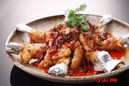 4、鍋入紅油50克,燒至七成熱時,放入干辣椒10克小火炒香,出鍋澆在羊蹄上,撒上香菜葉點綴即可。