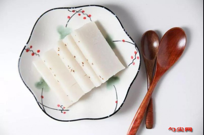6.此時年糕已蒸熟,只是色澤還很白,將上下層對換,再蒸1小時,使色澤更深些。將筷子插入年糕中,不粘筷即可。用兩支鍋鏟將年糕挖入鋪有玻璃紙的圓模中,再用中火蒸至表面光滑。