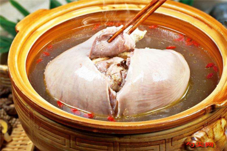 3、將腌好的雞裝進豬肚里,找一根鋼釬或竹簽,將豬肚的口縫起來;將縫好的豬肚放到砂缽里,加入適量的水,放入姜片,蓋上鍋蓋大火燒開后轉文火,煲3個小時,中間水如果少了,千萬不可加冷水要加開水;