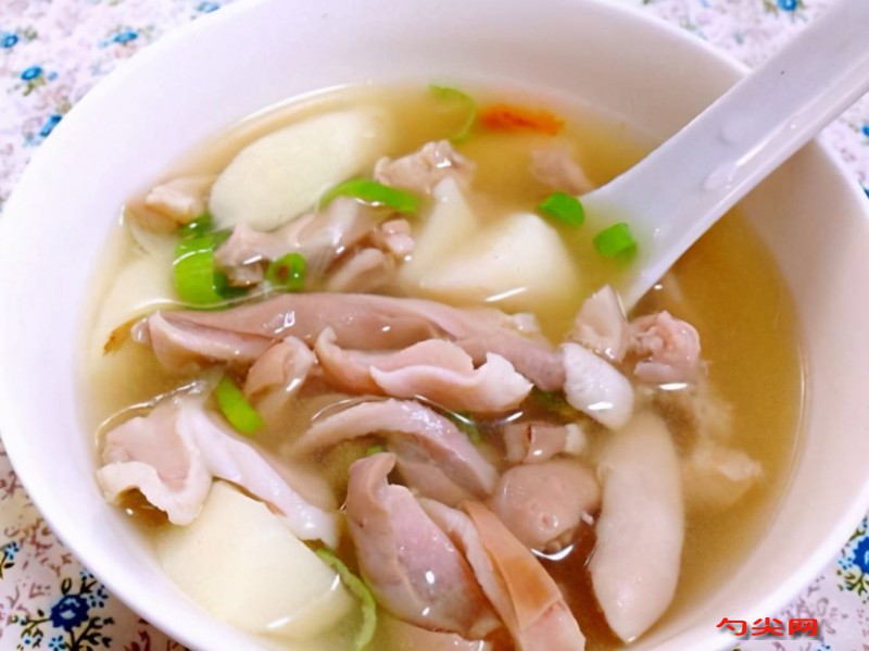 4、原湯加入豬肚、栗子、山藥片、紅椒、加鹽、胡椒調味略煮即可出鍋。