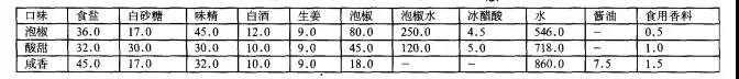 開袋即食雞爪最常見的調味方式是腌制,也稱為為泡制。根據具體的方法和需要,腌制的時間一般幾個小時到幾天不等。腌制使用的調味醬配料種類較多,以泡椒鳳爪為例,使用的配料包括水、食鹽、白砂糖、味精、白酒、生姜、泡椒、泡椒水、冰醋酸、水、食用香料等。食鹽的濃度、醋酸的濃度以及腌制的時間是影響雞爪口味、色澤和脆度的重要因素,需要進行反復的試驗分析,根據目標要求來進行合理的比例調配。除了泡椒口味的雞爪,酸甜和咸香口味的雞爪也比較受群眾喜愛。所以,經過一系列反復試驗,重點研究這幾個風味的產品,得出風味較佳的配料組合。泡椒、酸甜、咸香口味的風爪調味湯汁配方比例見下表。