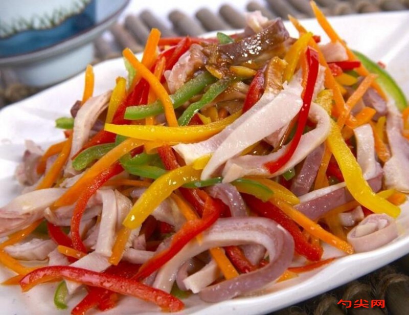 制作:豬肚內壁翻出,洗凈,再翻回原狀.咸鴨蛋煮熟,去殼取黃與皮蛋均切成粒,每粒約1.5厘米見方.豬肉切成丁,約0.6厘米見方.火腿切成細粒.香菜切成段,每段約1厘米.豬皮刮洗干凈,放入沸水鍋內煮至六成軟爛,取出,切成粒,大小如黃豆.將豬肉丁、精鹽、味精放入盆中,攪至起膠,加入蛋黃、皮蛋,豬皮拌勻,再加入香菜,芝麻油攪成餡料.攪拌好的餡填入豬肚內,用線繩縫口.然后放入湯鍋內,用中火煮約30分鐘,撈出,用鐵針扎數小孔.再放入湯鍋內,用微火煮約2小時至軟爛,撈出.再放入用旺火燒沸的白鹵水鍋中,改用微火煮15分鐘后,連白鹵水一起倒入盆內.再加汾酒(白酒),浸泡約10分鐘、撈出.冷卻后放入冰箱冷藏約2小時取出,用刀橫切兩段,每段又切作兩片,然后分切成片,每片厚0.3厘米.裝盤時拼砌成扇形或圓形即成。