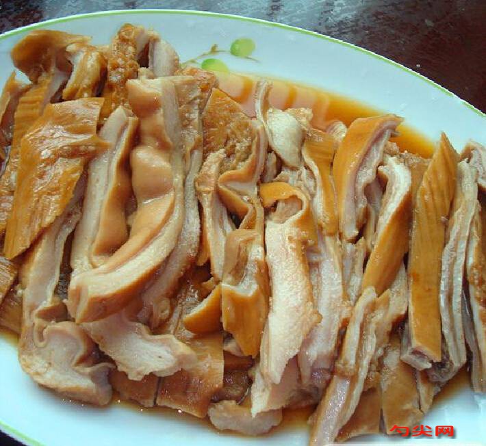 4、出鍋時,用鉤子先勾住肚頭,在鍋內將粘在豬肚上面的浮沫刷凈,撈出后把肚子里面的湯水控出。將出鍋的豬肚掛在熏肚的木架上,點燃架下的鋸末使之起煙,直熏至豬肚成黃色止(鹵后加一道熏的工序,是是些地區的風味做法,一般鹵后即可食用)。食時,切片裝盤。