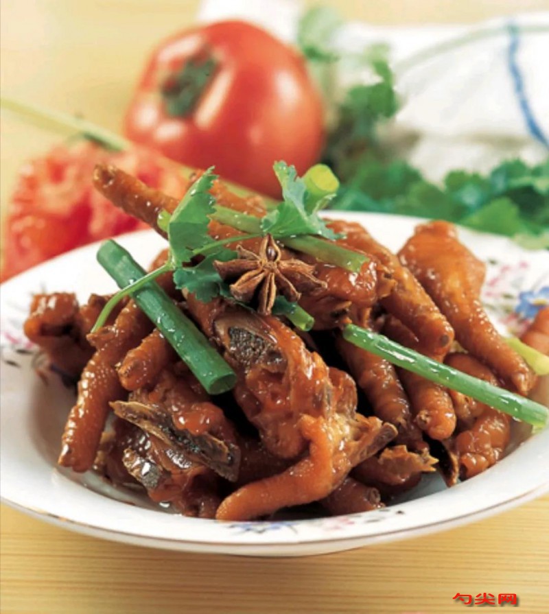 工藝:1.把雞爪洗凈,切去爪尖,縱切兩半;炒鍋放大火上, 放入食用油,燒至八成熱時,將雞爪下鍋,炸至皮酥、呈金色時撈出瀝油2.把高湯、富磷聯B 、味達蕾903號、蔥、姜、料酒、大料、花椒、丁香、肉桂、陳皮、醬油、鹽、白糖、雞爪放入砂鍋,調中火,燒開后轉用小火,蓋上砂鍋煮2小時,至肉質酥爛,淋上香油即可。