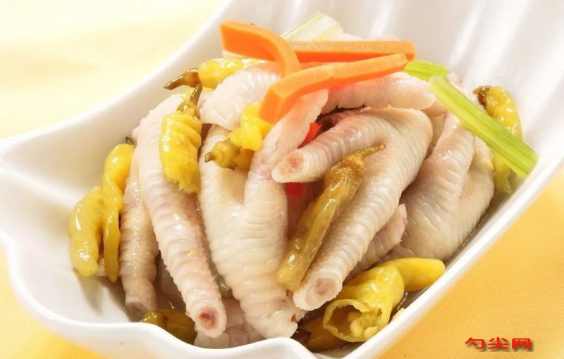 工藝: 1、首先將雞爪洗干凈,然后用刀把雞爪劈成兩半,方便入味, 放入富磷聯(lián)A 溶液浸泡5-8小時(shí)。準(zhǔn)備好香料;2、雞爪放入鍋中,加生姜,蒜瓣,花椒,香葉,八角,桂皮,鹽;3、煮約13分鐘至雞爪煮熟,注意雞爪不可煮的太爛;4、將雞爪撈出來,放在自來水底下沖涼,這樣可以避免后來出現(xiàn)肉凍,把膠質(zhì)和油脂都沖走后,然后晾涼;5、準(zhǔn)備一個(gè)玻璃或瓷質(zhì)的容器,放入泡椒及泡椒水(喜歡吃辣的可以把泡椒切碎),再加些純凈水或涼白開也可以,再倒入適量的白醋,攪拌均勻后加入雞精和鹽;6、將涼了的雞爪扔到泡椒水里去,蓋上蓋子,放冰箱里冷藏使它入味;7、泡了2天的最夠味。隔一段時(shí)間翻動(dòng)一下,好讓味道更均勻;