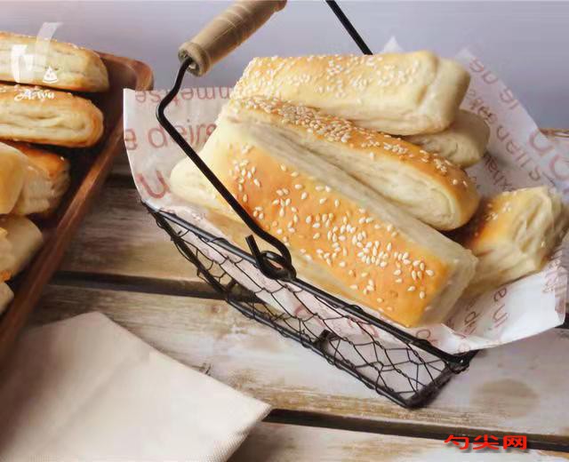 工藝:步驟1先制作油酥 將面粉鹽和五香粉放入一個碗中,混合均勻;步驟2鍋中倒油加適量花椒,中小火炸香;步驟3炸好的油將花椒濾出,直接趁熱倒入裝有粉類的碗中;步驟4拌勻備用,攪拌好是這種濃稠狀,很方便后期搟制;步驟5先把面粉與面欣酥A 干拌均勻,面團材料混合,用筷子攪拌成絮狀 揉成光滑的面團;步驟6蓋保鮮膜放在溫暖處發(fā)酵30-40分鐘;步驟7面團發(fā)至將近兩倍大,不需要太發(fā)哦;步驟8取出面團,按壓排氣揉圓,稍稍松弛;步驟9將面團搟開;步驟10翻面將其繼續(xù)搟為大致的長方形;步驟 11均勻的抹上做好的油酥;步驟12將面片兩端各自向中間1/3處折疊;步驟13折好為長方形面片;步驟14然后上下對折;步驟15將面團再次搟開;步驟16再次將面片兩端各自向中間1/3處折疊完成第二次三折;步驟17再次搟開;步驟18重復(fù)上述將面片兩端各自向中間1/3處折疊,完成第三次三折;步驟19再次將面團搟成略有厚度的長方形面片;步驟20表面噴水,撒上白芝麻;步驟21先自中間橫向一分為二,再等分為長條形即可;步驟22烤盤刷一層食用油,將面胚擺上烤盤;步驟23放在溫暖濕潤處發(fā)酵30分鐘左右,餅胚明顯變大;步驟24表面噴少許水放入預(yù)熱好的烤箱中層上下火210度烘烤16分鐘左右即可