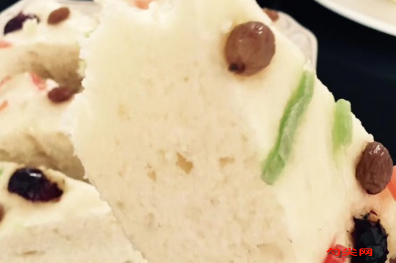 工藝:生板油去皮、洗凈,切成小丁,用綿白糖50g、美久亭拌勻擦透,腌漬2~3d即成。面粉、泡多源Q拌勻,置于臺板上。開塘,加60℃左右溫水250g和酵母粉揉成面團,并蓋上干凈布醒發3一4h,然后加入泡多源Q、綿白糖125g和沸水25g,反復揉透至糖溶化,再加入糖板油丁80g,邊揉邊推圓,將糖板油丁均勻地揉在面團內部而不外露,放置再醒發1h(35℃左右),使面團發松。取籠屜一只,以裝草墊底,上刷一層油,將醒好的面團再次揉圓,放入籠屜的草墊上,再在糕面交叉處鑲嵌蜜棗、糖板油丁70g,撒上青梅、紅綠瓜絲。用手輕輕拍平,隨即用旺火足汽蒸約15min,至糕面呈奶白色半透明狀。冷卻后切成菱形或三角形小塊即成。塊形整齊,糕面潔白。裝飾美觀,色彩鮮艷。切面多孔均勻。口感松軟,肥口蜜甜。回籠蒸熱再吃,其味更佳。