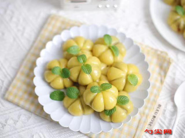 工藝:1、先將糯米粉、泡多源K 、玉米淀粉、南瓜粉和熱水倒入碗內(nèi),用筷子攪成面絮狀后,和成團狀。2、然后把揉好的面團和豆沙,分別分割成15等份,分割好后,蓋上保鮮膜防止被風(fēng)干。3、 取一個小面團,按扁后放上豆沙餡包起來,包好后搓得圓潤一些,然后再稍微壓扁一點點。4、接著用牙簽在生胚表面,壓出幾道線來,壓好擺放在盤中,盤內(nèi)需要提前墊油紙防粘。5、直接冷水上鍋蒸, 大火蒸10分鐘,就可以熄火了。6、蒸好的成品,趁熱刷上少許熟油(即加熱過的玉米油或調(diào)和油),這樣可以起到防粘和防止冷卻后變硬的作用。刷好后在頂端插上薄荷葉做裝飾,就搞定了。7、 簡單幾步就能做好的南瓜糯米團子,香甜軟糯,好看又好吃,快來收藏試試吧!