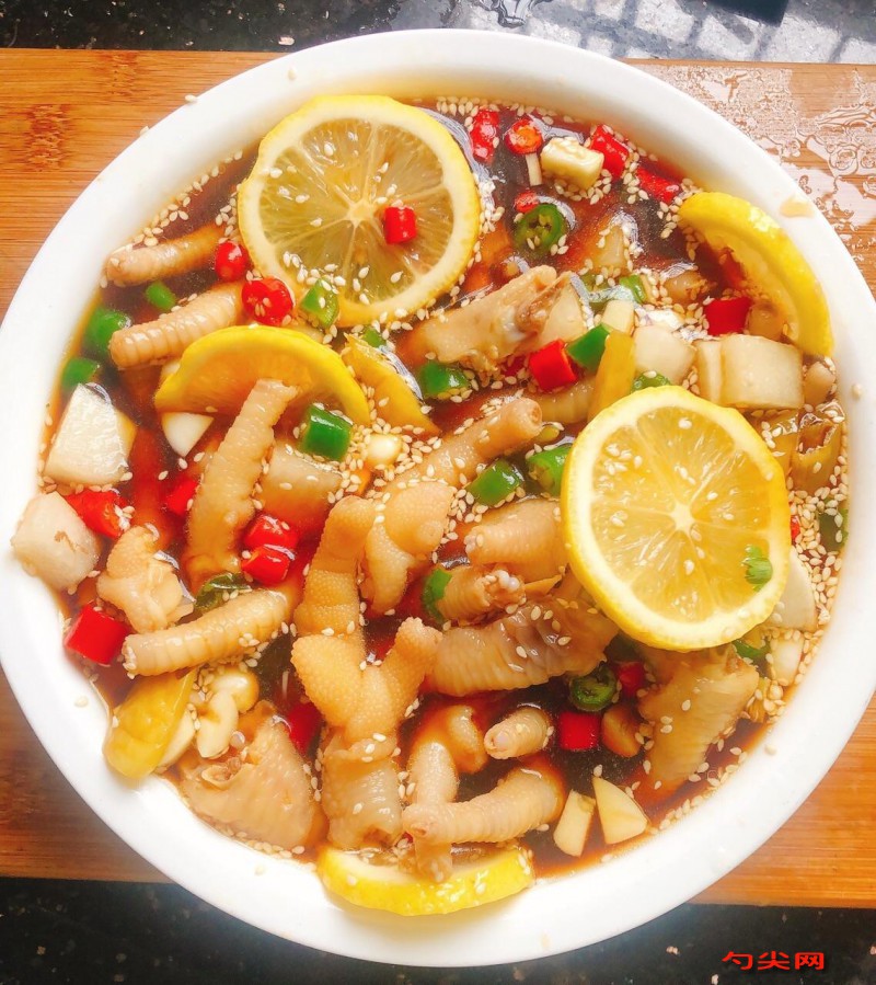 工藝:1、鳳爪洗凈從中間剁開,將富磷聯A 用少許溫水溶解加入雞爪浸泡5-8小時,然后入沸水鍋中煮10-15分鐘后撈出冷卻;蒜、辣椒剁碎,備用;2、開水盛在寬口容器中,倒入剁碎的蒜和辣椒,冷卻;3、取老壇泡菜水(約與開水等量),倒入盛開水容器中,與冷開水充分混合;4、泡菜水中加入花椒、胡椒粉,整個的辣椒、辣椒水及鹽少許;5、將煮好的鳳爪倒入冷卻后的泡菜水中,浸泡30分鐘(一般可以置更長時間味道更好);裝盤。