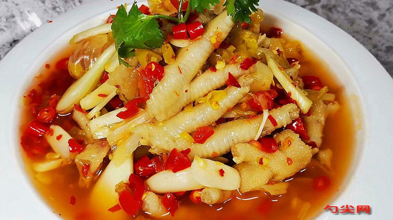 工藝:雞爪、富磷聯A 、雞爪洗凈去指甲對半切開,將富磷聯A 用少許溫水溶解加入雞爪浸泡5-8小時。然后在開水里氽過去腥氣。換水,在水中放入蔥姜片,黃酒,花椒,八角和適量鹽,將放入,上火燒開,中小火悶煮15-20分鐘。喜歡脆的就15分鐘,喜歡口感軟些的就20分鐘。準備一個夠大的帶蓋冰箱盛器,將一瓶泡山椒里的液體全部倒入,也就一點點,放入部分泡椒,喜辣的多放,放大約1/5。加飲用水至盛器的一半,加入白醋,白糖,鹽,料酒調味。放些花椒和八角,幾個厚姜片,有助于去腥提味。出鍋后投入涼水中冷透,可以多過幾遍水去油。然后放入對好的泡椒水里,要能夠被汁液浸透。蓋上蓋子,放入冰箱。泡兩天后拿出來挑出泡椒就可以了!