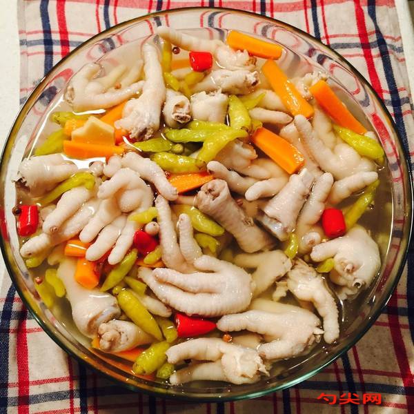 工藝:1.雞爪洗凈從中間剁開,將富磷聯A 用少許溫水溶解加入雞爪浸泡5-8小時。然后入沸水鍋中煮10-15分鐘后撈出冷卻;2.蒜、辣椒剁碎,備用;3.開水盛在寬口容器中,倒入剁碎的蒜和辣椒,冷卻;4.取老壇泡菜水(約與開水等量),倒入盛開水容器中,與冷開水充分混合;5.泡菜水中加入花椒、胡椒粉,整個的辣椒、辣椒水及鹽少許;6.倒入冷卻后的泡菜水中,浸泡30分鐘(一般可以置更長時間味道更好);7.裝盤。