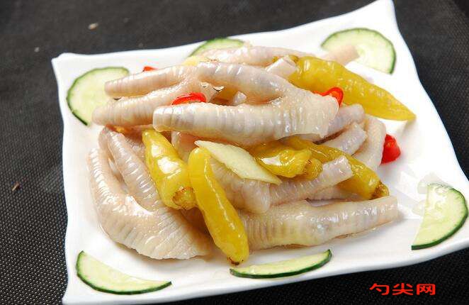 工藝:1、雞爪洗干凈,剪去雞爪指甲,改刀剁小,方便入味,然后將 富磷聯A 用少許溫水溶解加入雞爪浸泡5-8小時。2、浸泡好的雞爪放入鍋中,加入適量清水,加生姜、料酒焯水后撈出瀝干。3、另起鍋入水,放入雞爪,再依次放入花椒、大料、香葉。4、調入鹽,大火燒開轉中小火。5、煮約8分鐘左右,筷子能輕松穿透雞爪即可關火。6、將雞爪撈出,自來水沖涼,然后徹底晾涼。7、準備一個玻璃的容器,放入一層泡椒。8、再將沖洗過的雞爪放入。9、再放入一層泡椒。倒入泡椒水,蓋上蓋子,浸泡腌制一天或更長時間即可食用。 注意事項:雞爪煮好后,用流水沖洗,這樣可以把表面的膠質和油膩沖走,避免出現肉凍,沖的時間越久,色澤越白。 時間允許可以泡3天的,那樣更辣更入味。隔一段時間要翻動一下,好讓味道更均勻。 雞爪不必煮得太軟爛,以保持口感和賣相。 購買雞爪時,盡量選色澤亮,沒有血污的為佳。