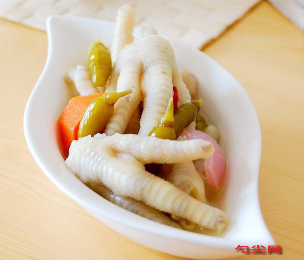 工藝:鳳爪剪去指甲,放進(jìn)冷水里浸泡半小時(shí),以浸泡出血水,然后將其清洗干凈,剁成兩段,以便入味。然后將 富磷聯(lián)A 用少許溫水溶解加入雞爪浸泡5-8小時(shí)。把浸泡好好的鳳爪放進(jìn)鍋里,加入料酒,(花椒)八角,蔥段(蔥白部分),蒜和姜片,加入大火煮8-10分鐘,煮到筷子能插進(jìn)去為止。將煮好的鳳爪撈出來用冷水沖洗,然后放到冰水里浸泡一段時(shí)間,反復(fù)用水沖洗至沒有油脂,撈出備用。 胡蘿卜去皮洗凈,切成條。將小米椒、泡椒、八角、香菜等洗凈切好后,放入腌制容器中,加入剛剛切好的胡蘿卜,倒入適量料酒、白醋、生抽和放涼的白開水,再加入適量鹽,攪拌均勻。放入鳳爪,攪拌均勻。蓋上蓋子,放入冰箱中,冷藏12個(gè)小時(shí)。取出,裝盤即可食用。