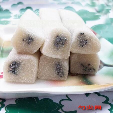 配方:白砂糖2.1kg,芝麻屑1kg,糕點粉2kg,泡多源Q100g,芝麻花粉少許,餡糖4.5kg,水1.2kg,白砂糖粉1kg