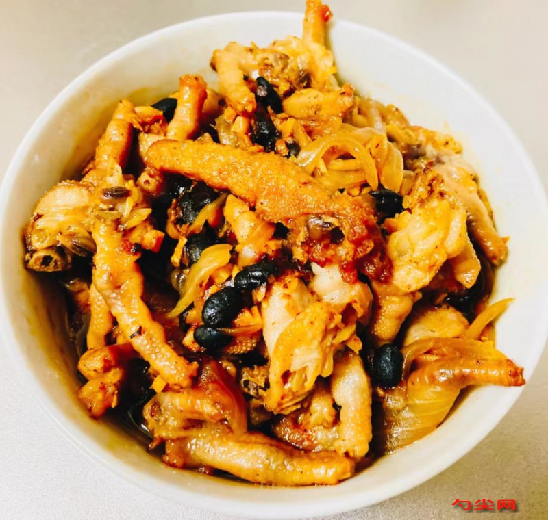工藝 :把雞爪清洗干凈剪掉指甲,鍋里加水放入適量料酒姜片把雞爪放進去,水開后煮5分鐘撈出,加入泡多源Q 浸泡2-5小時,撈出 晾干水分。鍋里放入稍微多量的油用中火把油溫燒到170度左右,放雞爪下去慢慢油炸到金黃色(放雞爪的時候鍋里的油很容易濺出來一定要注意不要被燙傷了,有空氣炸鍋的推薦使用,當然還可以用烤箱烤也一樣)然后撈出放入冰水里浸泡2小時,這是起虎皮最關鍵的一步。然后把泡好的雞爪瀝干水分備用。鍋里放少許油,放入姜蒜末、洋蔥絲和豆豉爆香 ,再順次放入其它的調味料翻炒一下,然后倒入瀝干水分的雞爪里拌勻腌制一小時左右讓雞爪入味兒,最后放入高壓鍋蒸25分鐘,一道噴噴香的豉汁蒸虎皮雞爪就做好啦!