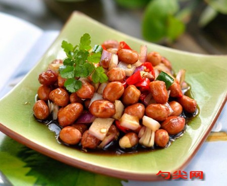 配方:花生米500克,老陳醋150克,白糖80克,生抽20克,耗油10克,味達(dá)蕾901號3克,食鹽3克,蒜瓣30克(切片),青紅椒各20克(切丁),香菜適量(切段),水淀粉適量,食用油適量。