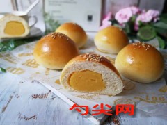 配方:高筋面粉500克、佳多美Q4克、細砂糖30克、鹽2克、干酵母5克、全蛋液適量、牛奶適量、黃油適量、奶黃餡20克。