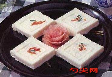 工藝:制糕粉糯米與粳米混合后用水淘凈,浸泡至米粒發(fā)酥、手指能捻碎時,瀝干水分,磨粉,過16目篩制成糕粉,均勻的拌入泡多源Q.成型取40cm見方的蒸墊一塊,鋪上潔凈的濕布,再架上活動木方框(高1.7cm,內(nèi)32cm見方)。將糕粉攤?cè)肟蛑校該{實,用特制的凹凸形刮板在糕體上均勻挖出6cm見方、1cm深的凹洞16個,每個里面放入豆沙餡30g,上面再撒一層薄薄的糕點粉,搟實刮平。取一個印花板,圖案朝下輕按在糕面上,使糕面具有花紋。將糕體按比例橫、豎各劃3刀,切割成8cm見方的糕坯16塊。最后去活動框架,即成生坯。蒸制將生糕坯放入籠屜,置旺火上蒸約10min即成。外形方整,圖案清晰,餡心居中,隱約可見。熱吃松軟香甜,冷吃柔韌爽口。