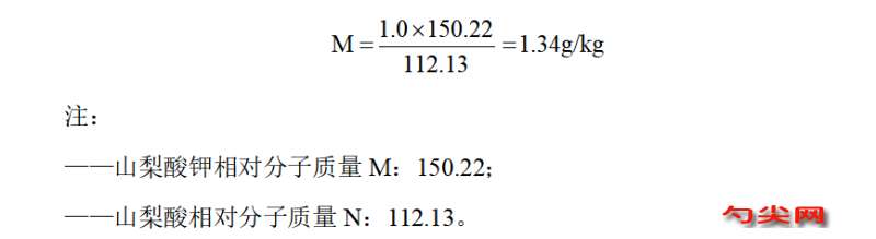 例如,按照GB 2760的規(guī)定,面包中山梨酸及其鉀鹽以山梨酸計(jì)的最大使用量是1.0g/kg,設(shè)山梨酸鉀的純度是100%時(shí),那么,按照上述折算公式,山梨酸鉀的最大使用量M計(jì)算公式如下: