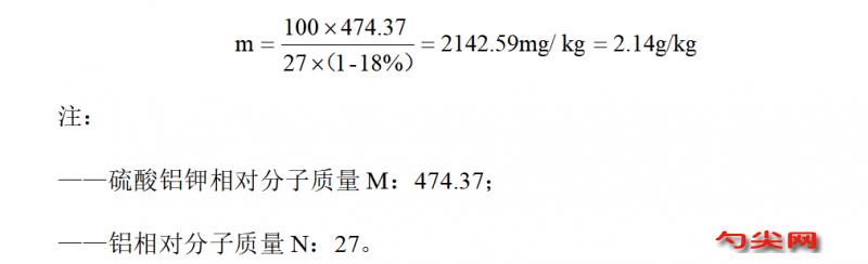 使用硫酸鋁鉀、硫酸鋁銨后,需要確定食品(干樣品)中鋁的殘留量不超過100mg/kg??梢园凑铡妒称钒踩珖覙?biāo)準(zhǔn) 食品中鋁的測(cè)定》(GB 5009.182-2017)中規(guī)定的檢測(cè)方法進(jìn)行檢測(cè),所得結(jié)果即是干樣品中的鋁殘留。食品中硫酸鋁鉀的允許使用量,可以按照使用的硫酸鋁鉀中的鋁含量進(jìn)行粗略折算,即:
