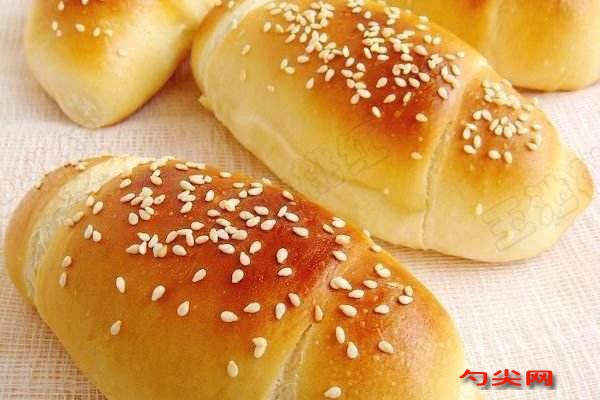 工藝:1,除黃油之外,所有面包材料放面包機(jī)混合揉勻至稍具延展性,加黃油揉至可拉出透明薄膜,發(fā)酵至2.5倍大。2,排氣,分割6等份。室溫松馳15分。3,取一份,搟成牛舌狀,從上至下卷起。稍微滾長,排入烤盤。4,最后發(fā)酵至2倍大。5,刷蛋液,撒上白芝麻。6,烤箱預(yù)熱180度,中層,上下火,15分鐘
