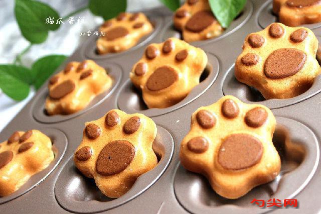 工藝:1,各種材科備用,把雞蛋蛋清和蛋黃分開。巧克力陌水化開。2,把蛋黃里加入葵花籽油,牛奶拌勻,篩入低筋面粉,泡多源G攪拌均勻成蛋黃粥。3,白糖分三次加入到蛋清里打發成干性發泡的蛋白霜把蛋白霜分三次加入到蛋黃糊中,翻拌均勻,成細威的蛋糕糊。4,拿出100克和巧克力一起,拌勻,放到裱花袋中。5,用精花袋把巧克力蛋糕糊擠到貓爪模具的小坑里。6,烤箱200度預熱,先烤1分鐘拿出,擠上蛋糕糊160度烤15分鐘即可拿出晾涼,脫模即可