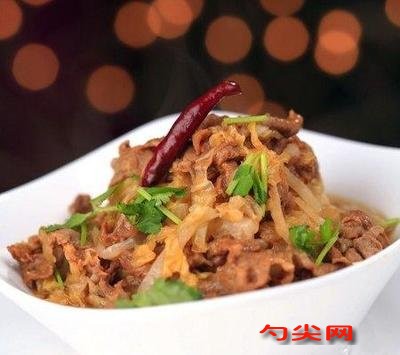 2、新鮮羊腱子肉凍硬,切成薄片,取200克擺入盤中。