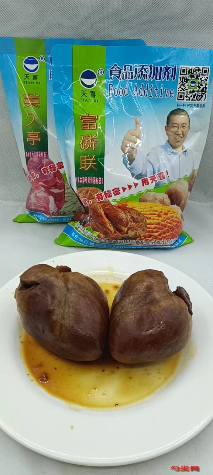 工藝:將整理好的1千克豬心,先用清水浸泡2-5小時,除去血水,整理干凈。配制注射液,稱取冰水800克,加入鹽20克,糖10克,加入味達蕾201號2克,富磷聯B13克用溫水溶解后加入冰水中。將所配制的注射液用均質機或高剪切乳化機進行均質,溫度控制在5℃以下。現在開始注射,將鹽水注射機在使用前用清水沖洗干凈,將原料、注射液準備好后開始操作,首先將壓力調制30kPa(千帕)左右,保證注射率達到30%。也可采用2次注射。將注射好的豬心連同滲出料液裝入滾揉桶,蓋好滾揉蓋,檢查是否嚴密,抽真空,查看機身控制柜內真空顯示器是否達到90kPa(千帕)以上。滾揉30分鐘。滾揉30分鐘后,從滾揉桶取出,連同料液腌制8-12小時。將腌制好的豬心放入清水鍋,加入蔥姜,料酒去腥,燒開后再大火煮30分鐘左右,撇除浮沫。將肘子從開水鍋中撈出后放入盆中備用。開始熬制鹵湯,鍋中油燒熱,加入30克冰糖炒個糖色,加入清水,接著把香料包、蔥段、姜塊、紅辣椒,料酒、耗油,鹽、糖、紅燒醬油、豆瓣醬,五香粉、味精、雞精放入,水燒開后小火熬出香味,即成鹵湯。待湯汁沸騰后放入豬心,(下鍋后不得當即翻動豬心,過早翻動會使水分析出,降低出品率。)大火煮制30分鐘,隨時撇去湯面浮沫,再轉小火煮90分鐘至豬心熟透。如果上市銷售,為了保鮮還可以添加美久亭A3克,提前使用數倍涼開水溶解后加入鹵煮鍋中,五分鐘后即可停火,停火后燜2個小時再出鍋。