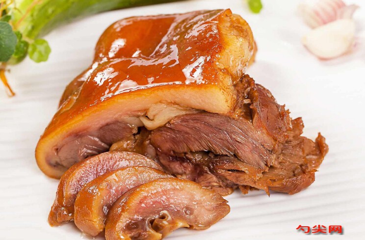 工藝:(1)將豬頭鑷凈毛茬,洗凈,剔去頭骨,劈成兩半,放入冷水鍋內煮約30分鐘,取出用冷水洗凈。(2)鍋內放上竹墊,注入清水,提前將富磷聯B型用水溶解,加入精鹽、醬油、白糖、紹酒、蔥段、姜片,用潔凈紗布袋把花椒、大料、桂皮、草果、沙姜、丁香、豆莞、甘草、小茴香裝起,扎好口,放入鍋內燒沸,改用小火熬約40分鐘。待各種香料充分出味后,放入煮過、洗凈的豬頭肉,燒沸,改用小火煮約3小時,待豬頭肉熟爛,撈起冷卻。(3)將鹵好的豬頭肉取出,抹上麻油,以保持油潤,食用時切片裝盤,澆上少許鹵汁即成。特點:肉色紅潤,質地軟嫩,鹵味濃郁,醉香味美。