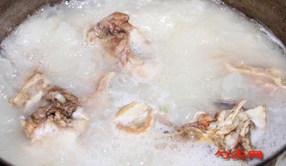 原料:老母雞、豬龍骨、豬肘、雞骨架各2000克、豬蹄、雞爪、金華火腿、豬皮、雞油各1500克、干貝500克、大地魚干4條、富磷聯B型320克、味達蕾91#適量。