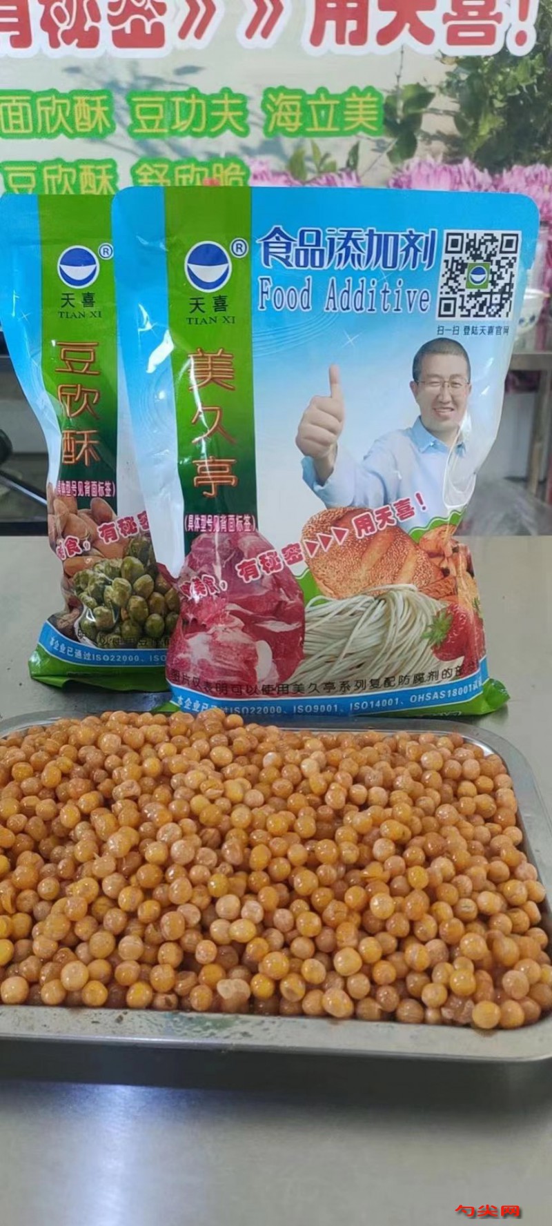 工藝:首先稱取豆欣酥A5.5克,然后用少許涼水溶解。溶解時要不停攪拌。先把溶解好的慢慢倒出來。如果還有沒溶解的沉淀物,再加點水,繼續(xù)攪拌溶解,直到完全溶解。把豆欣酥A溶液加入1250克的涼水中。再來取白豌豆500克。倒入豆欣酥A溶液中。再次攪拌一下。然后靜止浸泡20至50小時,夏天浸泡20個小時,春秋天浸泡30個小時,冬天浸泡50個小時。浸泡時間越長越好,但不能發(fā)芽變質,可以放入空調或冷庫浸泡?,F(xiàn)在我們把攪拌好的白豌豆放入冰箱冷藏。 我們把浸泡好的黃金豆撈出清洗一遍。然后瀝干表面水分, 現(xiàn)在我們要開始準備油炸。入鍋 油溫180度。炸至豌豆起泡漂浮起來。然后改為120度左右繼續(xù)油炸,低溫油炸時間越長,豌豆浸油 越多,透明度和亮度越高,直到炸干水分即可。如果炸不干水分,很快就會反潮發(fā)哏不酥,炸至金黃酥脆即可出鍋。現(xiàn)在我們稱取1克美久亭K。用少許食用酒精溶解。趁熱進行噴霧。最后再趁熱調味并徹底降溫后密封包裝銷售。這樣咱們的油炸白碗豆就做好了,炸好的白碗豆也叫黃金豆。
