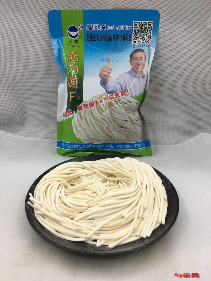 工藝:首先稱取高筋面粉475克。谷元粉25克,干拌均勻。再稱取筋力源F1.5克,然后用30度左右的溫水溶解。和入面粉中。再來稱取鹽兩克。美久亭F1克。美久亭F為復配防腐劑,現做現賣的鮮面條可以不加防腐劑,長時間保存的鮮面條添加美久亭F,同時采用食用酒精噴霧消毒。鮮面條儲存溫度8至15攝氏度比較合適。然后稱取水175克。再把食用鹽、美久亭F直接攪拌加入和面水中,然后攪拌倒入混合好的面粉中。將面粉倒入和面機中,和成絮狀面團。然后靜止醒發20至50分鐘。將面團放入軋面機即可軋鮮面條,一般軋面次數5-8遍,軋面次數越多,面條越筋道,但過度軋面會導致面條透明。軋好的鮮面條必須撒點干淀粉,防止粘連,然后放冷柜8至15攝氏度保鮮存放。這樣,咱們的機器軋鮮面條就制作完成了。
