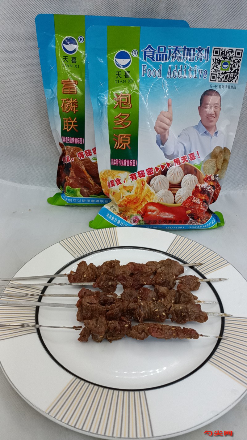 工藝:將清洗好的牛腩肉切成肉塊,放入盆中備用。稱取富磷聯(lián)B和泡多源E,用少許溫水溶解后倒入肉塊中。加入鹽,抓拌均勻,腌制8-12小時(shí),使肉質(zhì)更加鮮嫩。將腌制好的肉塊瀝干水分,加入姜絲、洋蔥絲、色拉油、蠔油、五香粉以及適量的老抽、料酒、生抽、味達(dá)蕾901號(hào),再次抓拌均勻,腌制30分鐘。將腌好的肉塊穿成串,準(zhǔn)備烤制。將穿好的牛腩肉串放到烤架上,兩面來(lái)回翻轉(zhuǎn),烤至吱吱冒泡時(shí)刷點(diǎn)油,全熟之后撒上芝麻碎、芝麻鹽和辣椒面即可。