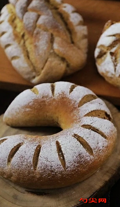 工藝:首先將種面團(tuán)的全部材料投入君焙廚師機(jī)的攪拌盆。干酵母提前溶解在50克左右的溫水(配方分量內(nèi))中,成為酵母水。然后將面粉、酵母水和剩下的水全部倒入攪拌盆。廚師機(jī)先低速檔位(1-2檔)攪拌2分鐘,然后調(diào)至稍高檔位(3-4檔)攪拌3分鐘。配方中使用大份量面團(tuán),因此我用的是君焙7升大容量的廚師機(jī)G1制作。如果你用的是4.8升的君焙廚師機(jī),請減少分量制作。G1的檔位跟4.8升的不一樣,如果用4.8升廚師機(jī)制作,選擇2檔。揉好的面團(tuán)是圖中的狀態(tài)。如果沒有廚師機(jī),手工揉面的流程一致,需要用力揉面,時間可能需要十幾分鐘。將種面團(tuán)蓋上濕布或保鮮膜,放在室溫下,使它緩慢發(fā)酵。大約需要發(fā)酵3-4個小時。發(fā)酵到面團(tuán)變大2-2.5倍,用手指輕輕按下去,按出的凹坑不會回彈,就說明發(fā)酵好了。避免發(fā)酵過度產(chǎn)生過多酸味。面團(tuán)需要經(jīng)過緩慢的發(fā)酵來產(chǎn)生足夠的風(fēng)味,保證面團(tuán)發(fā)酵時間達(dá)到3-4小時。如果面團(tuán)發(fā)酵速度過快,請降低面團(tuán)的溫度(放入冰箱或移至低溫涼爽處)。可以不可以用冷藏發(fā)酵法?——可以,將面團(tuán)放入冰箱冷藏并發(fā)酵24個小時。低溫冷藏發(fā)酵會極大延緩面團(tuán)發(fā)酵的速度,制作出更有風(fēng)味的面包。冷藏24小時后,面團(tuán)變大2倍即可。如果面團(tuán)沒有變大到足夠的程度,將它從冰箱取出,讓它回復(fù)室溫并繼續(xù)發(fā)酵到2倍大,再進(jìn)行后續(xù)步驟。將主面團(tuán)的材料全部投入攪拌盆里(包括軟化后的黃油)。然后把發(fā)酵后的種面團(tuán)壓扁排氣后也放入攪拌盆。廚師機(jī)低速檔位揉2分鐘,然后調(diào)至稍高檔位(3-4)檔,揉7-8分鐘即可。此時面團(tuán)通常能達(dá)到初步的擴(kuò)展階段。為什么黃油可以一起加進(jìn)去,不需要后放?——黃油后加是因?yàn)橛椭瑫绊懨娼畹男纬桑酝ǔH嗟矫娼畛醪匠尚鸵院笤偌狱S油。但黃油后加也會降低一部分揉面效率(畢竟把黃油重新揉入到面團(tuán)里需要花費(fèi)很多功夫),所以當(dāng)配方中黃油的用量很少時,對面筋形成影響不是那么大,可以一開始就一起加進(jìn)去。如果是小分量的面團(tuán),揉面時面團(tuán)受到的壓力沒有大面團(tuán)那么充分,因此反而揉面的時間會更長一些,請根據(jù)實(shí)際情況調(diào)整。不同面粉吸水性不一樣,請根據(jù)實(shí)際情況調(diào)整水的用量,避免面團(tuán)太硬或太過粘手。全麥面粉中的麩皮會阻礙面筋形成,因此100%全麥面粉制作的面團(tuán),是很難揉出強(qiáng)韌的膜的。圖中已經(jīng)是100%全麥面團(tuán)能達(dá)到的不錯的程度,這個膜很脆弱,隨便一碰就會破裂。我們不需要揉出非常強(qiáng)力的膜,甚至只要揉到能看到膜的雛形即可(面團(tuán)不是隨便一扯就斷,能被有限地扯開)。揉好的面團(tuán),放入盆里蓋上濕布或保鮮膜,再次發(fā)酵。這次發(fā)酵需要大約1個小時,直到面團(tuán)再次變大至原來的1倍大小。如果不想用中種法,想制作過程更快怎么辦?——采用直接發(fā)酵的方法,將干酵母的用量增加至12克(小分量面團(tuán)增加至2.5克),將種面團(tuán)和主面團(tuán)的所有材料全部一次性攪拌成面團(tuán),并揉到初步達(dá)到擴(kuò)展階段即可。然后將面團(tuán)進(jìn)行大約1個小時的基礎(chǔ)發(fā)酵,并按下面的步驟繼續(xù)制作即可。將發(fā)酵好的面團(tuán)充分排出空氣,然后均勻分成5份,蓋上保鮮膜或濕布醒發(fā)10分鐘。之后就可以整形成各種造型了。面團(tuán)的最后發(fā)酵,如果你有發(fā)酵箱或者烤箱有帶濕氣的發(fā)酵功能,可以直接發(fā)酵。如果沒有,可以在烤箱放一大碗熱水,將面團(tuán)放入并關(guān)上烤箱門發(fā)酵。當(dāng)夏天溫度足夠高的時候(30℃左右),可以直接在室溫下發(fā)酵,在面團(tuán)表面蓋上濕布防粘。最后一次發(fā)酵,請注意不要發(fā)酵過度。面團(tuán)明顯變大,用手指輕輕按壓面團(tuán),按下去的凹坑會緩緩回彈一半,就發(fā)酵得差不多了。如果按下去不回彈甚至塌陷,說明發(fā)酵過度了。發(fā)酵過度的面團(tuán)在烘烤時會失去后續(xù)的膨脹力,甚至出現(xiàn)口感發(fā)酸、組織粗糙等情況。烘烤的溫度大約在上下火220℃,烘烤18分鐘左右。烘烤到面包表面呈淺棕紅色出爐。剛出爐的面包表面會有一層硬殼,面包在冷卻過程中外殼會變軟。