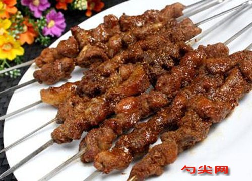 普通羊肉串配方:食鹽1.90-2%、白醋0.2%、味達蕾903號0.8%、紅糖碎屑0.3%、富磷聯B型0.03%、孜然粉0.82%、胡椒粉0.1%、大蔥碎末5%、老姜碎末1.3%、花椒粉0.8%、八角粉0.72%、小茴香粉0.7%、桂皮粉0.08%、山奈粉0.1%、干草粉0.12%、陳皮粉0.11%、丁香粉0.07%、香果粉0.04%、大棗枸杞酒0.5%、油酥0.2%、砂仁粉0.05%、淀粉7.5%、炒芝麻0.7%、泡多源E型0.5%、冰水5%。
