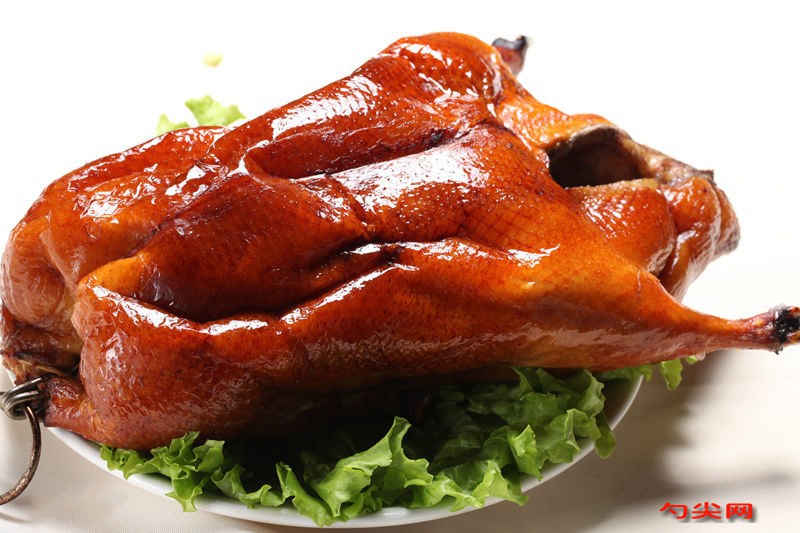 工藝:按照上述比例依次稱取物料,把制作好的香辛料水過濾后加入配置好的物料中,攪拌均勻。待浸泡液溫度降至10℃以下使用。選用符合衛生要求的預冷的白條鴨,重量控制在1.2kg左右。解凍水溫或者環境溫度控制在20℃以下,解凍至鴨中心溫度-2-4℃時為止。解凍好的白條鴨修去浮毛和其它雜質。修整好的白條鴨沿腹中線剪開,不要把鴨腹部肉及皮切透。清洗干凈內臟瀝干水分備用。清洗干凈的白條鴨放入浸泡液中腌制8-12h,要求中途攪拌一次,保證均勻入味。腌制好的白條鴨用篦子固定后掛起來瀝干水分,表面干爽為準,表面刷一層脆皮水,表面水分收干后掛入烤爐中烤制。130-150℃烤制1.5h,220-250℃烤制20min即成品。